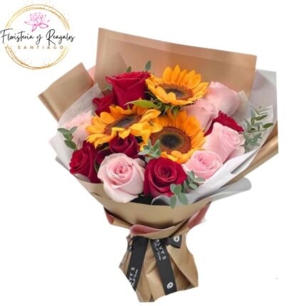 RAMO 5 ROSAS 1 GIRASOL ENVOLTURA ABIERTA