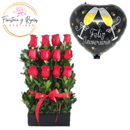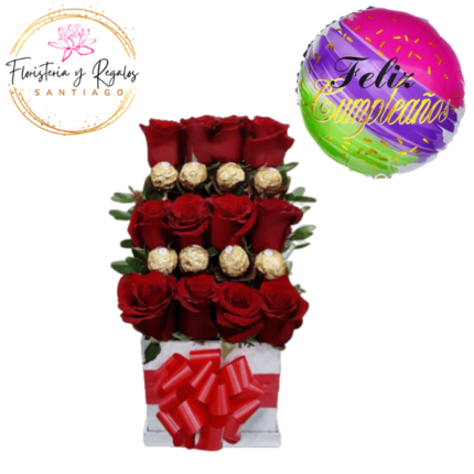 CAJA BOX DE 12 ROSAS ECUATORIANAS, BOMBONES Y GLOBO