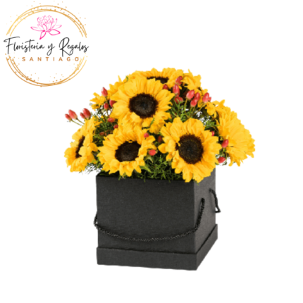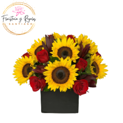 CAJA BOX DE 8 ROSAS, 8 GIRASOLES Y FOLLAJE