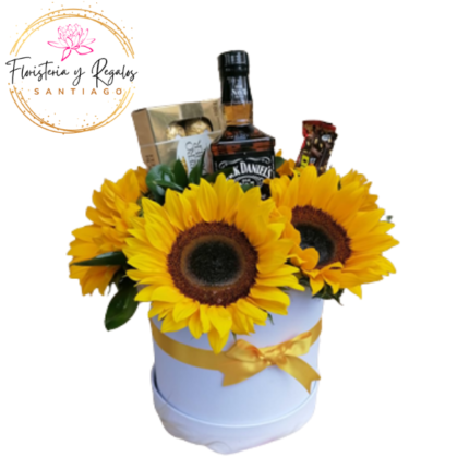 CAJA BOX DE 3 GIRASOLES, VINO Y BOMBONES