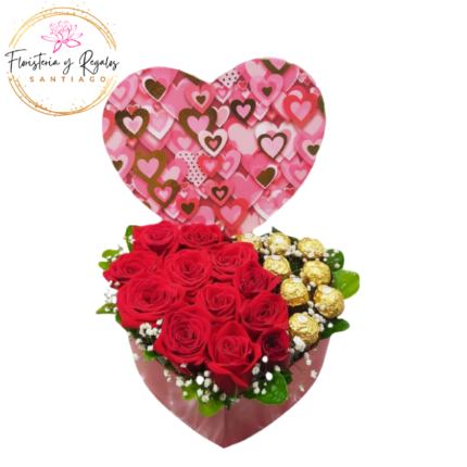 CAJA CORAZON DE 12 ROSAS Y 20 BOMBONES FERREROS ROCHER