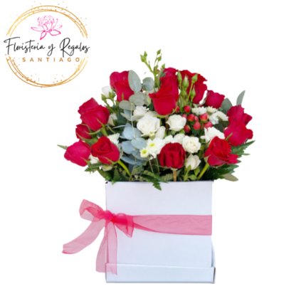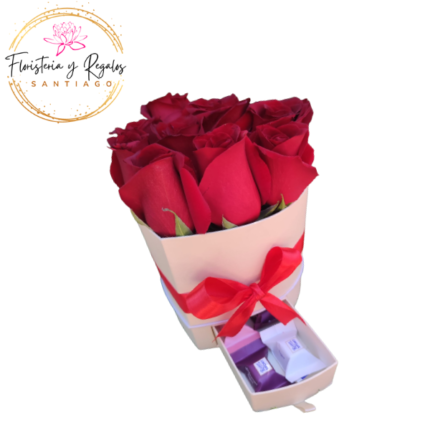 CAJA BOX CUADRADA DE 12 ROSAS ECUATORIANAS Y 8 BOMBONES