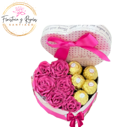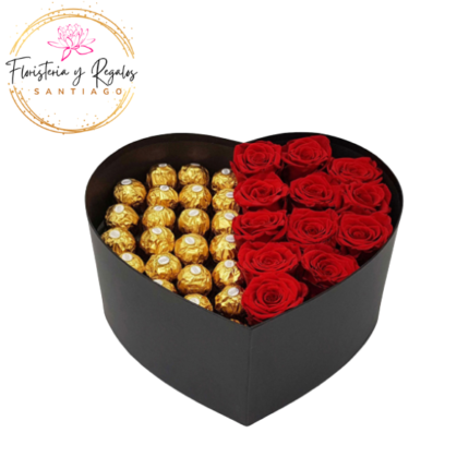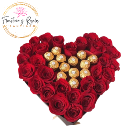 CAJA CORAZON DE 30 ROSAS Y 10 BOMBONES FERREROS ROCHER