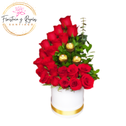 CAJA BOX DE 22 ROSAS ECUATORIANAS Y 3 BOMBONES FERREROS