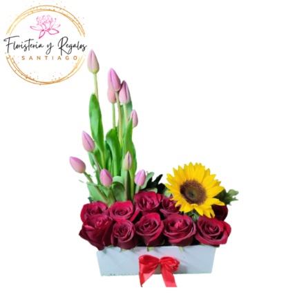 CAJA BOX DE 6 ROSAS, GIRASOL, 5 TULIPANES Y FOLLAJE