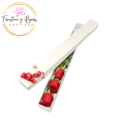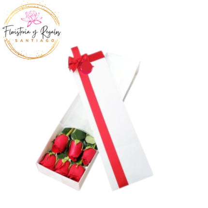 CAJA RECTANGULAR DE 6 ROSAS IMPORTADAS, 6 BOMBONES Y CHAMPAGNE 375ML