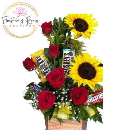 FLORERO DE 6 ROSAS 6 GIRASOLES Y BOMBONES LEXUS