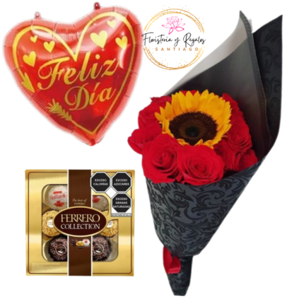 ARREGLO 8 ROSAS 2 GIRASOLES 6 BOMBONES Y GLOBO