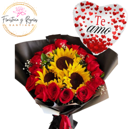 RAMO 15 ROSAS, 3 GIRASOLES Y GLOBO