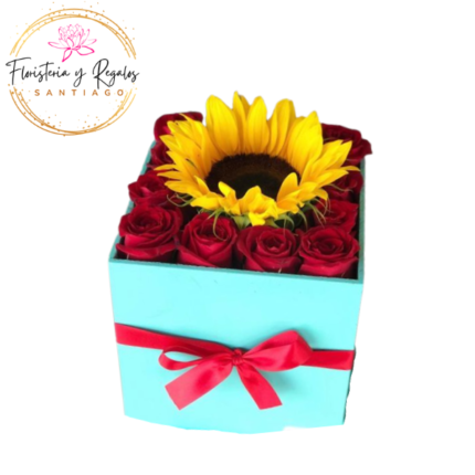 CAJA CUADRADA 12 ROSAS Y 1 GIRASOL