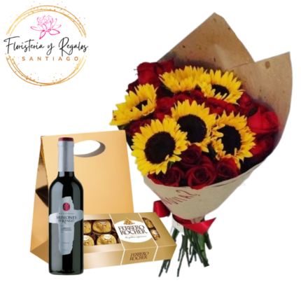 BOX 3 GIRASOLES, BOMBONES FERREROS ROCHER 100GRS, VINO 750ML Y GLOBO