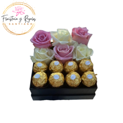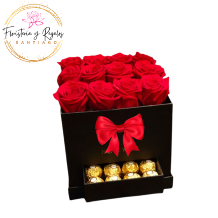 CAJA CUADRADA DE 12 ROSAS Y 8 BOMBONES FERREROS ROCHER