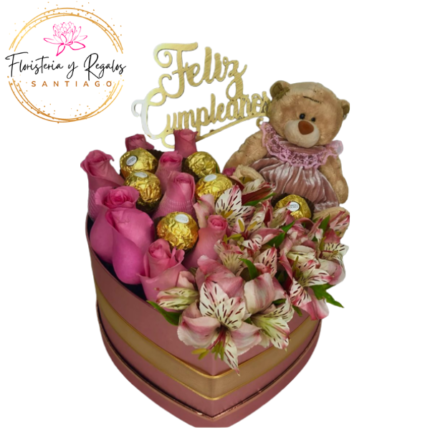 CAJA CORAZON DE 10 ROSAS, 6 BOMBONES, FOLLAJE, TOPPER Y PELUCHE DE 20CM