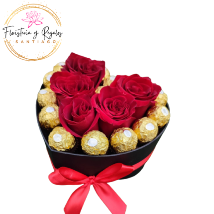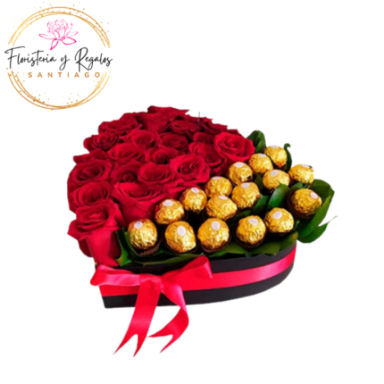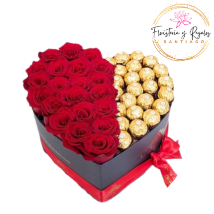 CAJA CORAZON DE 30 ROSAS Y 10 BOMBONES FERREROS ROCHER