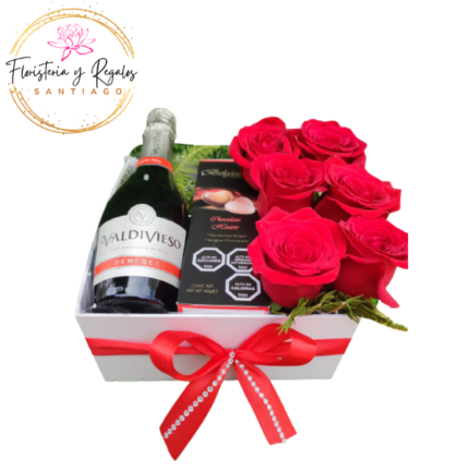 CAJA CUADRADA DE 6 ROSAS, BOMBONES Y CHAMPAGNE