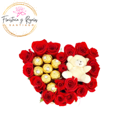 CAJA CORAZON DE 18 ROSAS, 8 BOMBONES Y PELUCHITO