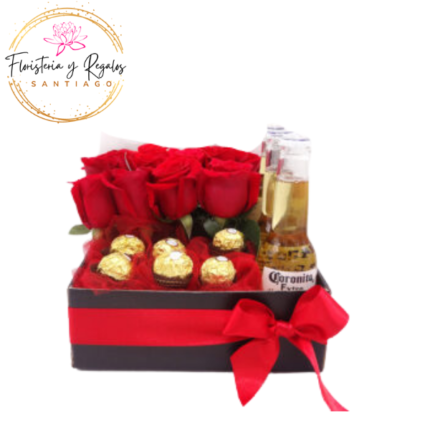 CAJA CUADRADA DE 12 ROSAS ECUATORIANA, CERVEZAS Y BOMBONES