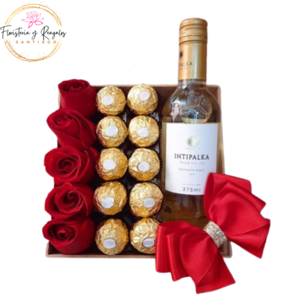 CAJA CUADRADA DE 5 ROSAS, 10 BOMBONES Y VINO 750ML
