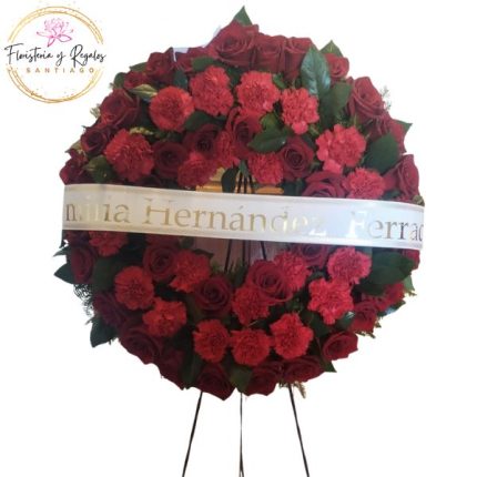 CORONA FUNEBRE CON 25 ROSAS, 20 CLAVELES, CINTA Y ATRIL
