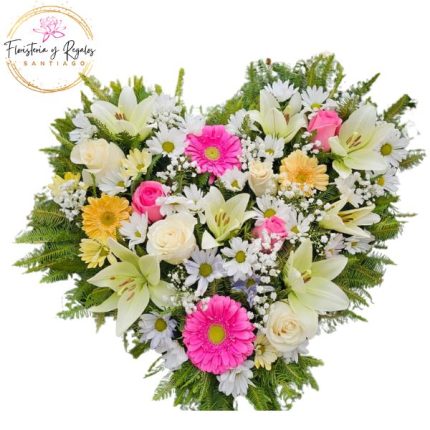 CORONA CORAZON DE 3 GERBERAS, 6 ROSAS, 6 LILIUM, MARGARITAS, FOLLAJE Y ATRIL