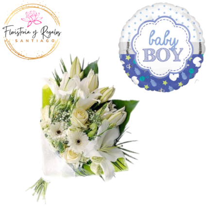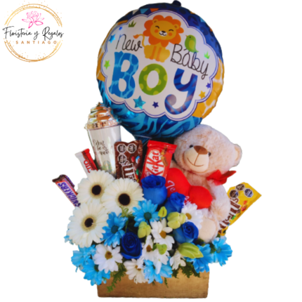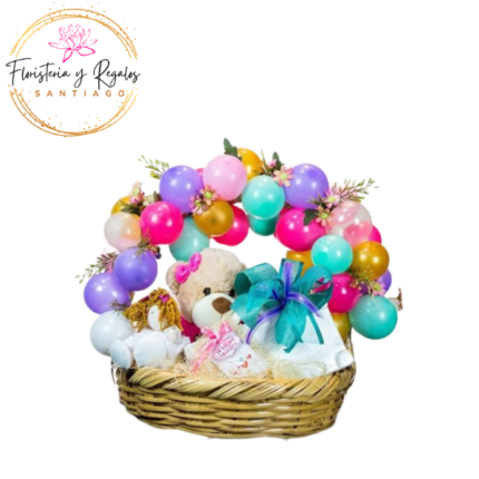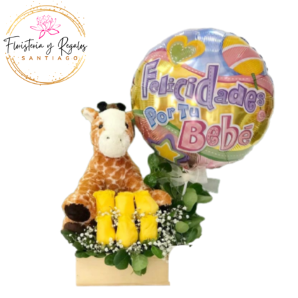 ARREGLO DE PELUCHE 30cm + 3 PRODUCTOS DE BEBE Y ARCO DE GLOBOS