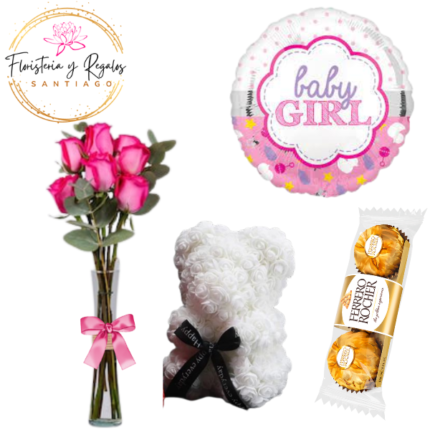 FLORERO 6 ROSAS + OSO TEDDY, FERREROS 3UNIDADES + GLOBLO
