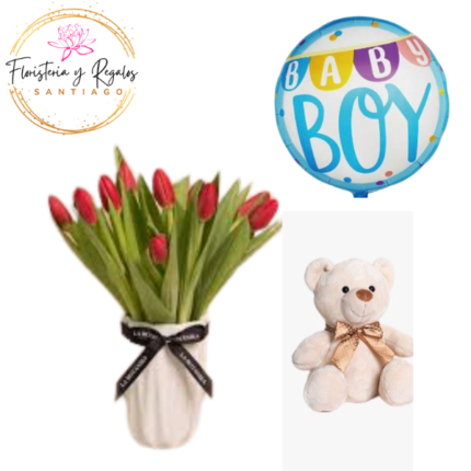 FLORERO DE CERAMICA 20 TULIPANES + PELUCHE 20CM + GLOBO