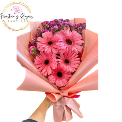 RAMO COQUETTE DE 5 GERBERAS Y CAJA DE BOMBONES FERREROS ROCHER DE 300G