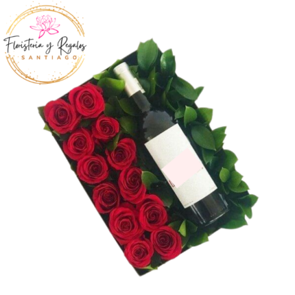 CAJA CUADRADA DE 5 ROSAS, 10 BOMBONES Y VINO 750ML