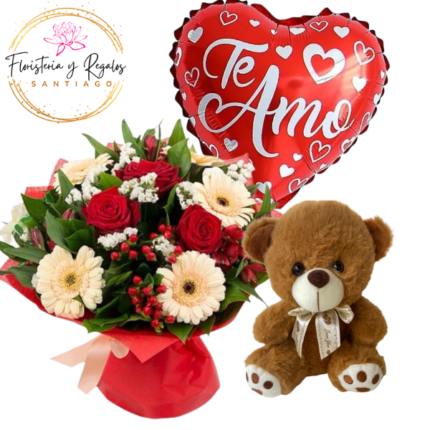 RAMO 5 ROSAS, 3 GERBERAS, FOLLAJE, PELUCHE Y GLOBO