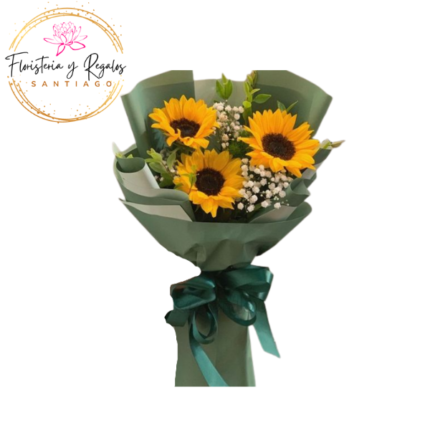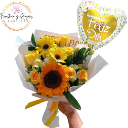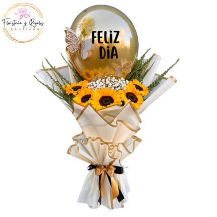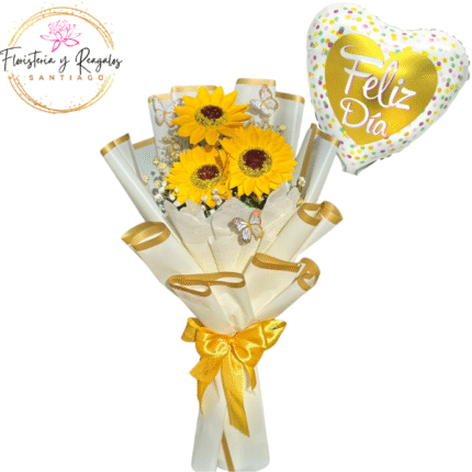 RAMO SANTIAGO DE 3 GIRASOLES JABON Y GLOBO METALIZADO