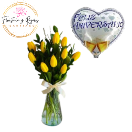 FLORERO DE 10 TULIPANES Y FOLLAJE + GLOBO