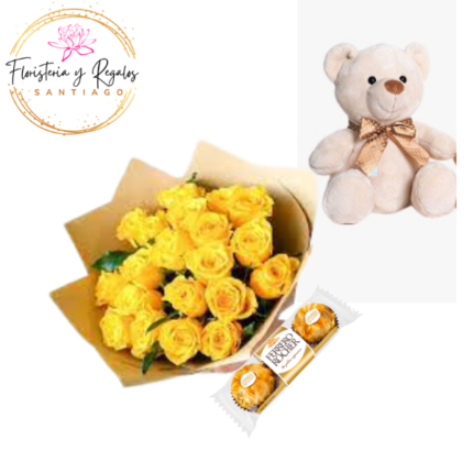 RAMO 20 ROSAS + FERREROS ROCHER 3 UND + PELUCHE 20 CM