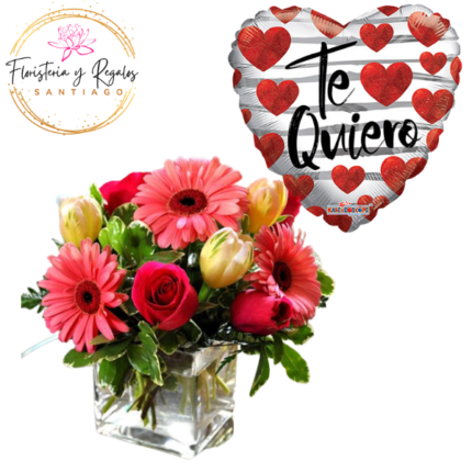 CUBO DE VIDRIO CON 3 GERBERAS, 5 ROSAS, FOLLAJE Y GLOBO