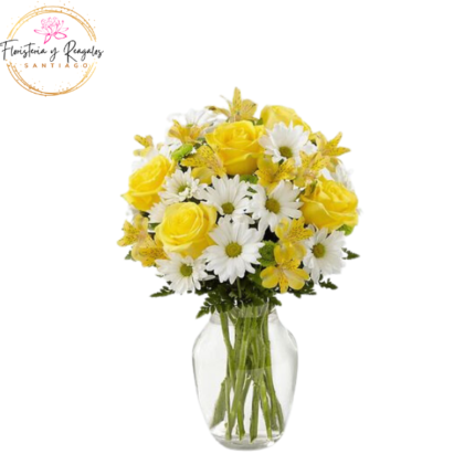 FLORERO DE 6 ROSAS, MARGARITAS Y FOLLAJE