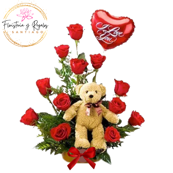ARREGLO 12 ROSAS + PELUCHE DE 25 CM Y GLOBO