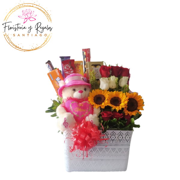 ARREGLO 9 ROSAS 3 GIRASOLES PELUCHE DE 25 CM Y CHOCOLATES NACIONALES 4 Y IMPORTADOS 4