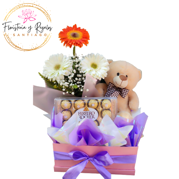 Bonito arreglo con peluche y lindas gerberas y no puede faltar unos deliciosos bombones