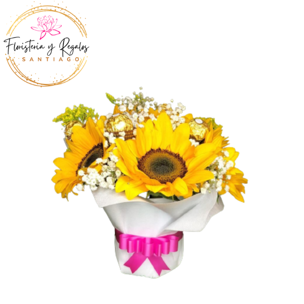 ARREGLO DE 4 GIRASOLES 3 BOMBONES FERREROS ROCHER