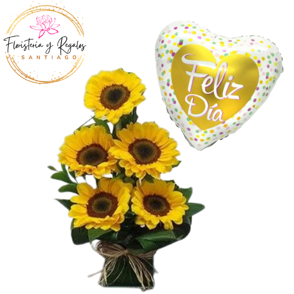 ARREGLO DE 5 GIRASOLES Y GLOBO