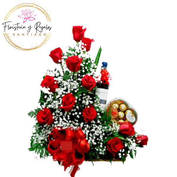 ARREGLO EN BASE CON 13 ROSAS + VINO 750ML Y FERREROS ROCHER DE 100G