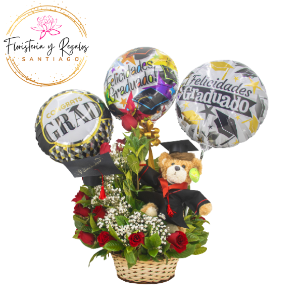 ARREGLO GRADUADO 8 ROSAS PELUCHE 25 CM + 3 GLOBOS