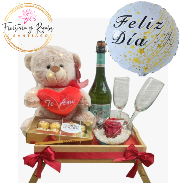 BANDEJA PELUCHE DE 25CM. CHAMPGNE 750ML COPAS. ROSA PRESERVADA Y FERREROS ROCHER DE 100G + GLOBO
