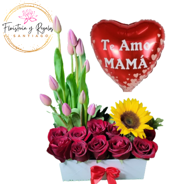 InicioFLORES Y RAMOS DIA DE LAS MADRES BASE DE 10 TULIPANES 10 ROSAS 1 GIRASOL + GLOBO