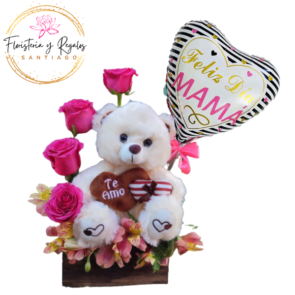 InicioFLORES Y RAMOS DIA DE LAS MADRES BASE DE 4 ROSAS + PELUCHE DE 25 CM + GLOBO