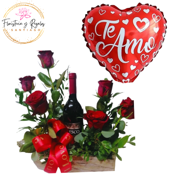 InicioDIA DE LOS ENAMORADOS MUJER BASE DE MADERA DE 6 ROSAS, VINO DE 750ML Y GLOBO