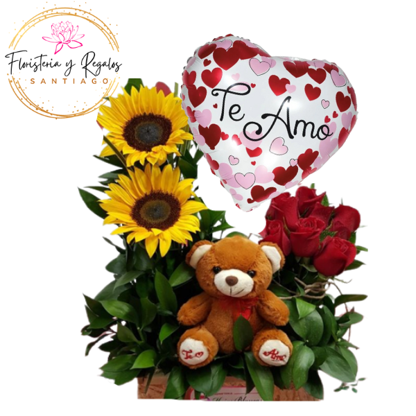 BASE RECTANGULAR DE 6 ROSAS, 2 GIRASOLES, PELUCHE 20CM Y GLOBO