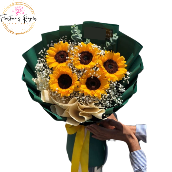 BONITO RAMO 5 GIRASOLES CON ILUMINACION Y HERMOSA ENVOLTURA