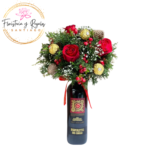 InicioNAVIDAD BOTELLA DE VINO CON TOQUE FLORAL Y 3 BOMBONES