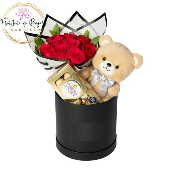 BOX CON RAMO FLORAL 12 ROSAS + FERREROS DE 100G Y PELUCHE 20 CM